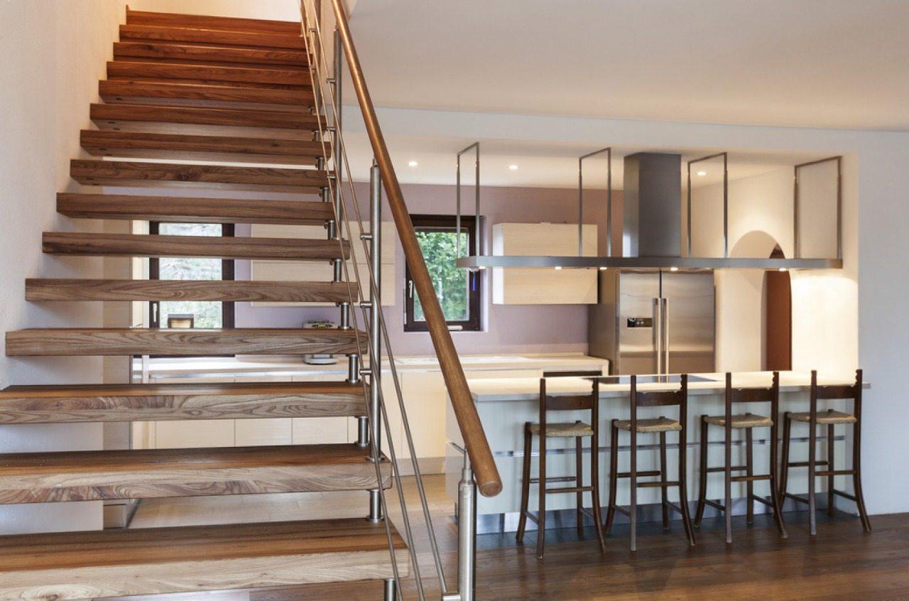 Прямая открытая лестница: Если хочется создать ощущение простора, сделать лестницу настоящим акцентом гостиной или холла — открытая конструкция из дерева идеально подойдет. Она визуально облегчает интерьер, подчеркивает широту и наполненность светом.